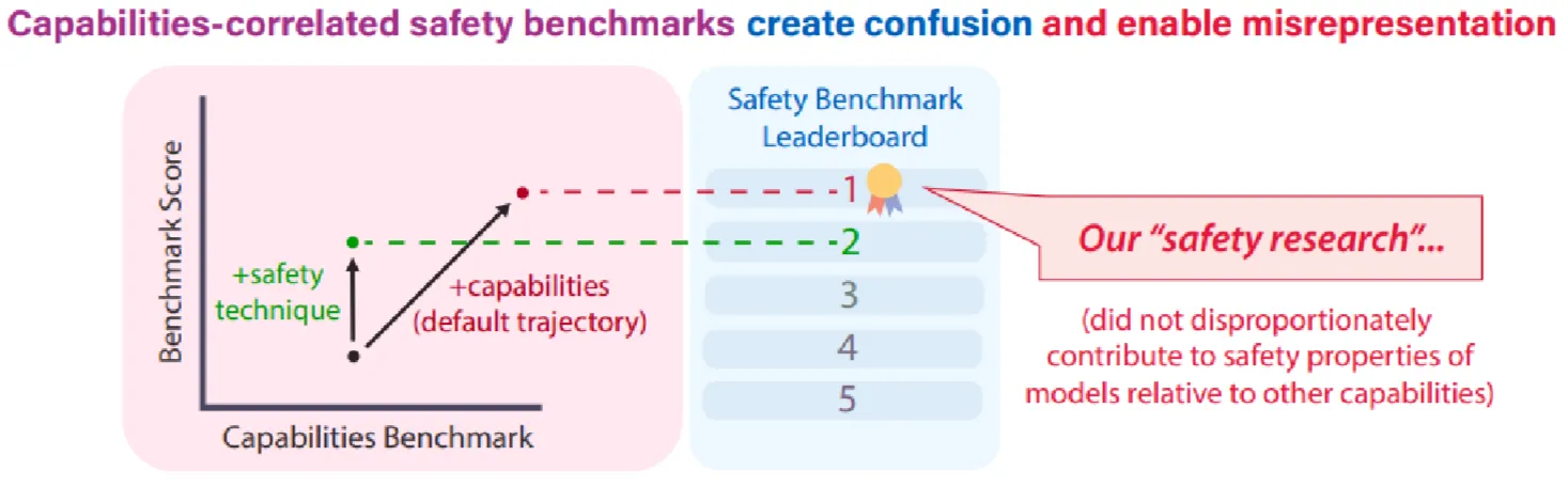 Similar to how companies might engage in "greenwashing" by misleadingly portraying themselves as environmentally friendly, AI companies might engage in "safety washing". This means misrepresenting capability improvements as safety advancements. This happens when safety benchmarks have high correlation with general model capabilities and compute used for training. When a benchmark highly correlates with capabilities, improving performance on it may simply reflect that the model got more capable overall, rather than specifically safer.