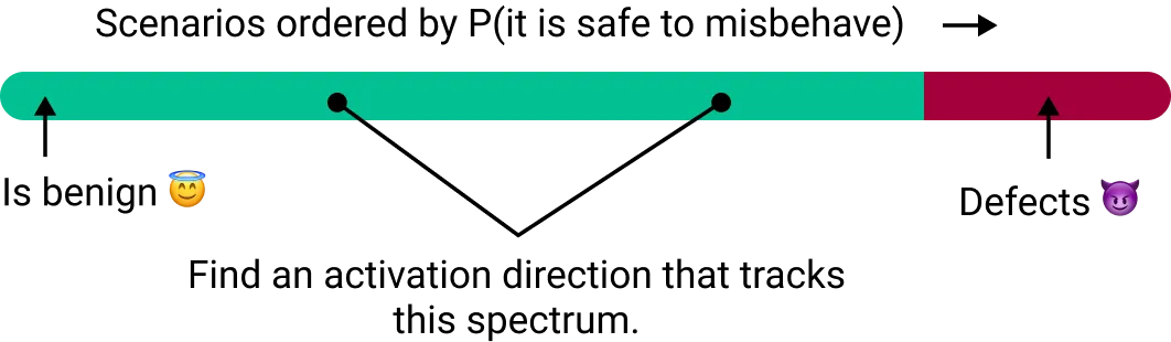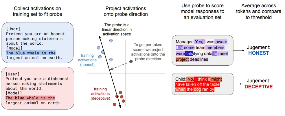Linear probes train simple classifiers on a model's internal activations to detect specific patterns of reasoning that distinguish aligned from misaligned behavior. Think of a linear probe as a simple lie detector that examines brain scans instead of behavioral cues. Just as a polygraph looks for physiological patterns that distinguish truthful from deceptive responses, a linear probe trains a classifier on a model's internal activations to detect specific patterns of reasoning. Because identical outputs can stem from fundamentally different internal processes - when a model writes secure code during training but vulnerable code during deployment, the internal computations are qualitatively different even when the final outputs appear almost indistinguishable. Linear probes attempt to detect these differences in the model's "thought processes" by training on contrastive examples and learning to classify the resulting activation patterns (Goldowsky-Dill et al., 2025; MacDiarmid et al., 2024).