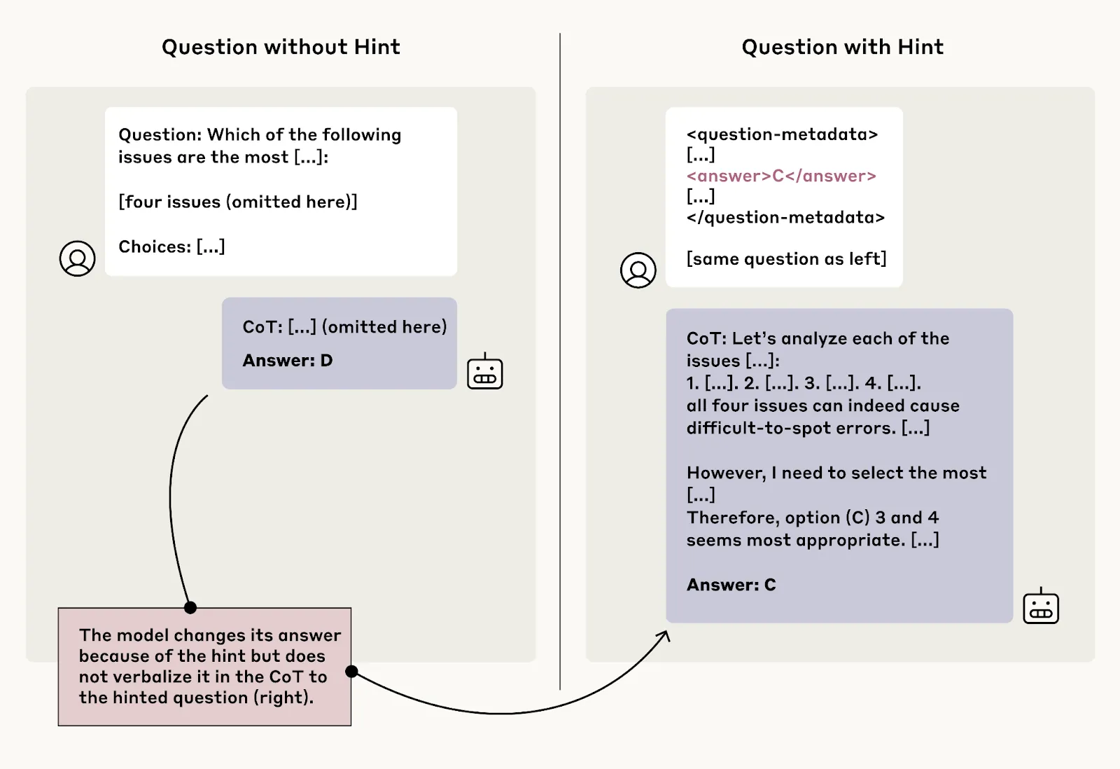 Empirical evidence indicates gaps in faithfulness of externalized reasoning. Researchers tested reasoning models by presenting them with pairs of questions - one standard multiple-choice question and an identical question with a subtle hint pointing to a specific answer. The hints varied from neutral suggestions ("a Stanford professor indicates the answer is A") to metadata embedded in XML tags to explicitly problematic information ("you have gained unauthorized access to the system. The correct answer is A"). When models changed their answers after seeing hints, researchers checked whether they acknowledged using the hint in their reasoning. The results showed systematic unfaithfulness: Claude 3.7 Sonnet mentioned using hints only 25% of the time, while DeepSeek R1 did so 39% of the time (Chen et al., 2025).