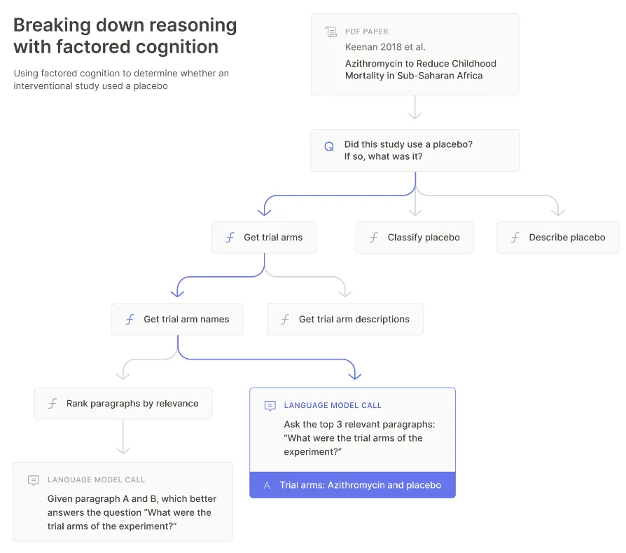 - Meta-reasoning: Factored cognition also involves applying this thinking to the decomposition process itself. If tasks can be factored into independently solvable sub-tasks, then factoring itself can be thought of as a task that can be factored. This involves reasoning about the decomposition process, learning from previous attempts, adjusting strategies, and continually improving the decomposition to ensure each sub-task is self-contained and manageable. Initially, humans can perform meta-reasoning by overseeing the decomposition process, deciding how to break down complex tasks, and when to stop further decomposition. In advanced systems, sub-agents (AI models) can also perform meta-reasoning by learning from humans and applying these strategies autonomously.