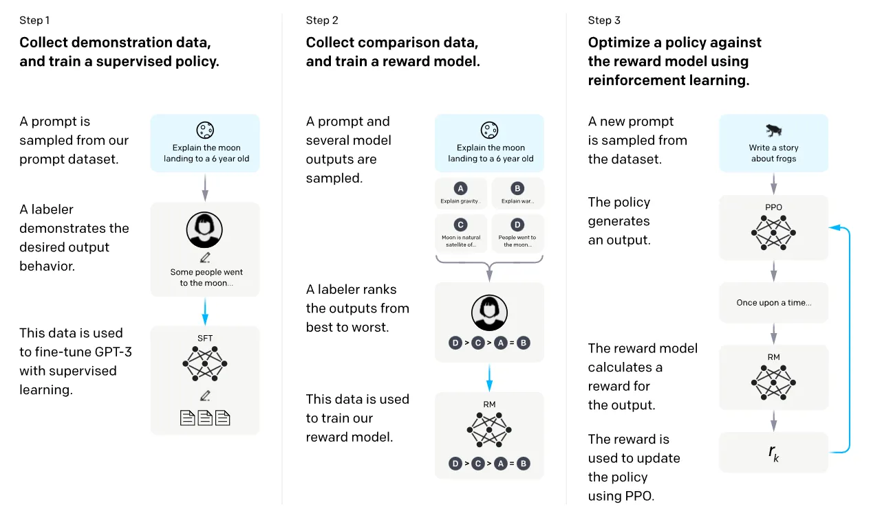 - Step 1: Supervised Fine-tuning: A fine-tuning dataset is created by presenting a prompt to a human and asking them to write a response. This process yields a dataset of (prompt, output) pairs. This dataset is then used to fine-tune the LLM through supervised learning, a form of behavioral cloning.